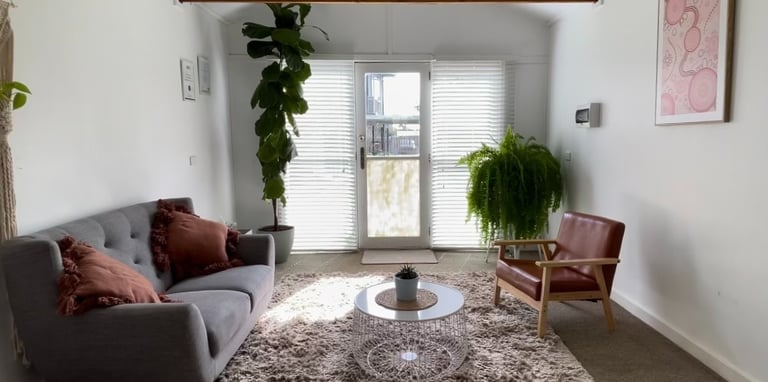 The counselling room offers a professional space that is also warm and inviting. Situated in a separate building at the rear of a residential property, the counselling room ensures complete privacy during each session. You'll enter into a room that is set amongst lots of greenery to create a sense of calm.